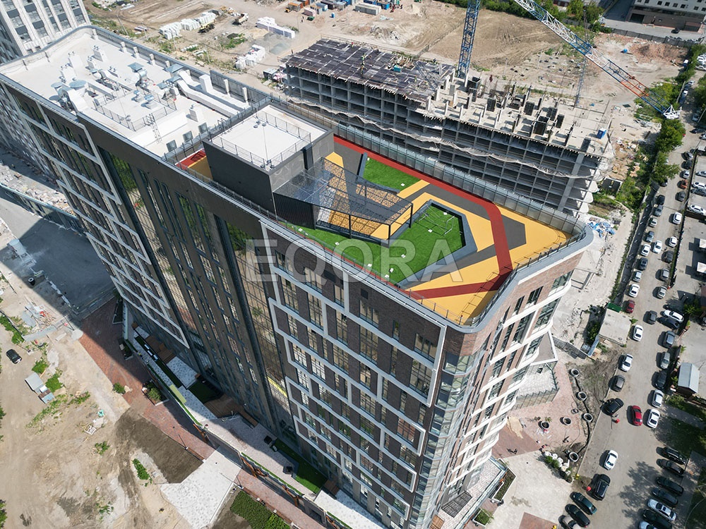 Материал: эластичное травмобезопасное покрытие из резиновой крошки EQORA SBR с амортизирующей подложкой толщина от 20 до 100 мм Объект: ЖК «Машаров» г. Тюмень Площадь: 500 м2